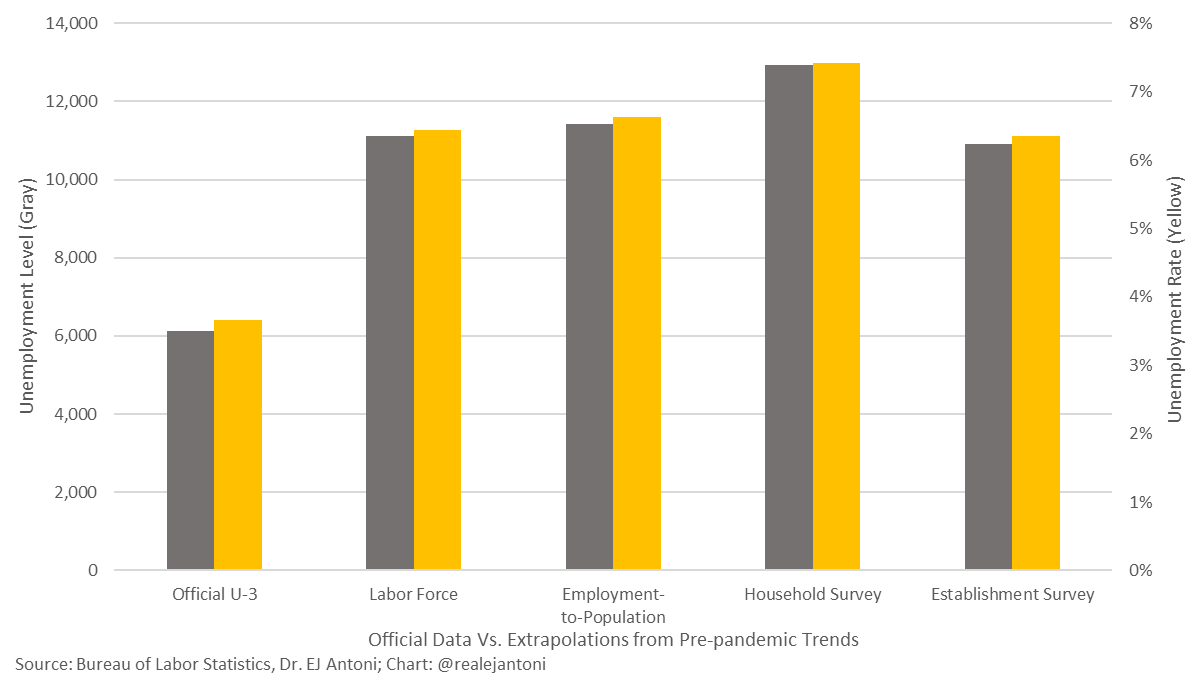 E.J. Antoni, Ph.D. (@RealEJAntoni) ~ Depending on which methodology you prefer, you can calculate a more realistic unemployment rate that accounts for all of these missing workers: somewhere between 6.3% and 7.4% - that's not horrific, but significantly higher than "official" 3.7% ...